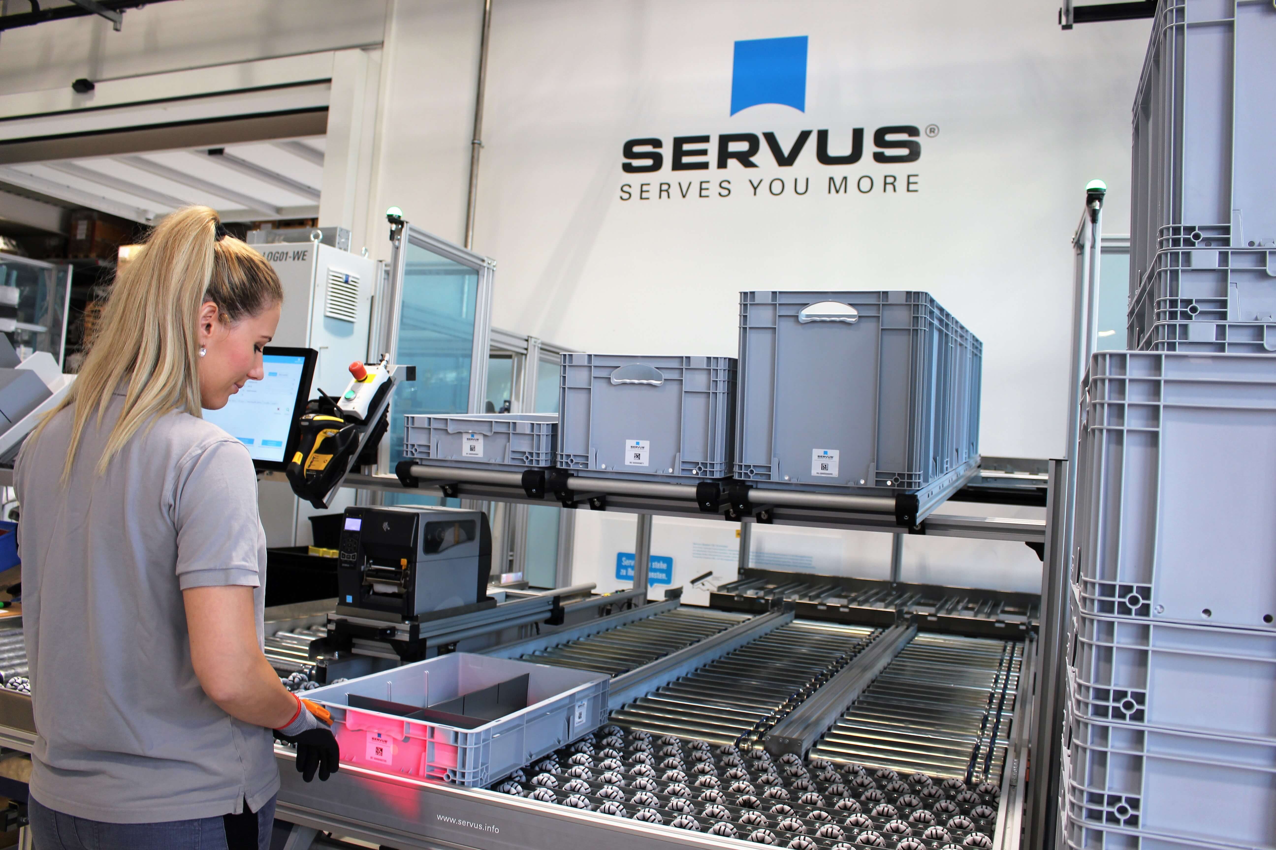 - Das Lager ist schnittstellenlos an die Servus Kommissionierstationen angebunden.