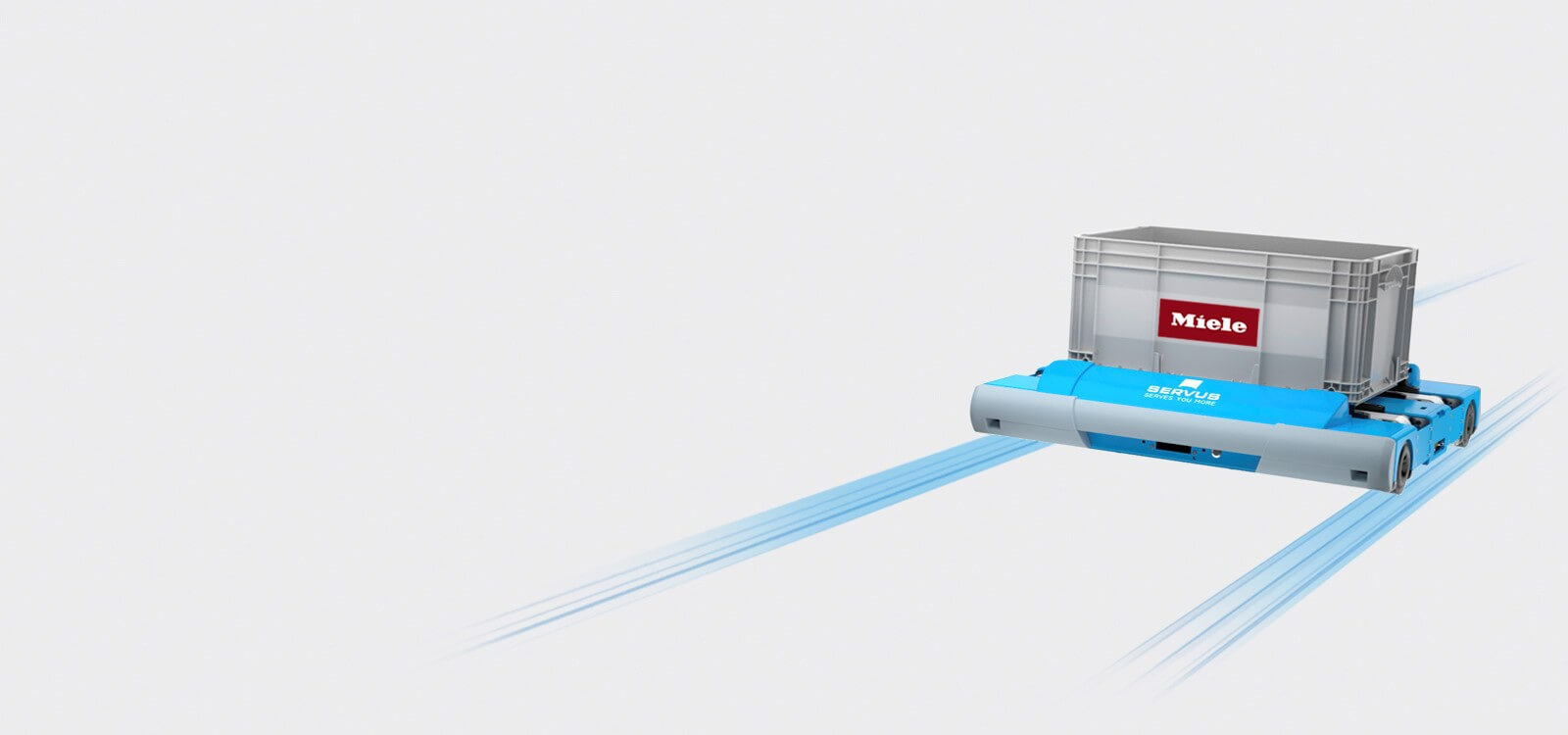 Miele versorgt seit 2014 die Montagelinien mittels Servus. Täglich werden 4500 Waschmaschinen gefertigt. Die dafür benötigten Materialien, Kleinteile und Komponenten werden u.a. vom Servus System in einem AKL gepuffert und in der richtigen Menge, zur richtigen Zeit geliefert. Das System wird laufend an sich ändernde Anforderungen angepasst und erweitert, um die Effizienz der Produktionslogistik stetig zu steigern.